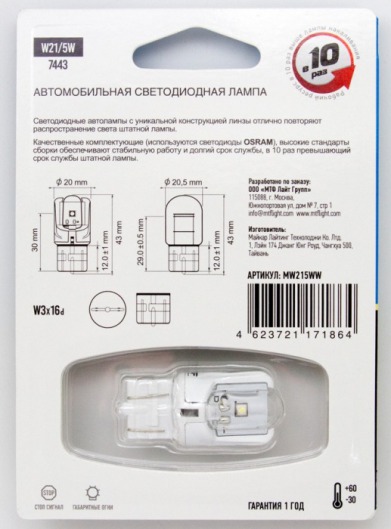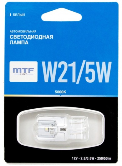 Светодиодная лампа MTF Light W21/5W 2.6/0.6W с уникальной конструкцией линзы отлично повторяет распространение света штатной лампы. Цвет свечения автолампы: красный.