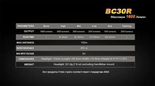 Что касается надежности велофары, то она дополнительно увеличена за счет прочного алюминиевого корпуса. К тому же, оболочка Fenix BC30R защищена от дождя, благодаря чему фонарь можно использовать при любой погоде.