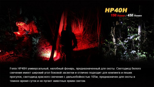 Фонарь Fenix HP40H укомплектован 2 светодиодами: красным Cree XP-E2 яркостью до 150 люмен и белым Cree XP-G2 (R5) яркостью до 450 люмен. Оба полупроводниковых прибора отличаются большой долговечностью и в состоянии проработать 50 000 ч. Несмотря на то, что красный свет менее яркий, его луч лучше сфокусирован, что позволяет освещать территорию радиусом 105 м. Белый светодиод, напротив, дает широкую боковую засветку, создавая удобные условия для туристов, вынужденных шагать в темноте по лесным тропинкам, а также спелеологов, велосипедистов и других потенциальных пользователей данного осветительного устройства.