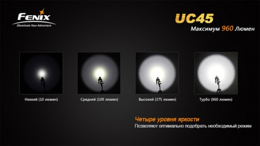 Fenix UC45 Cree XM-L2 (U2) LED использует современный мощный диод Cree XM-L2 (U2) с высокими эксплуатационными характеристиками. Он способен работать не менее 50 000 ч без заметной потери яркости. Яркость света, которую способен предложить фонарь своему пользователю, достигает значения 960 люмен. Помимо максимального значения, которое соответствует режиму Turbo, фонарь работает еще в 3 установках яркости, а также мигающем тактическом режиме Strobe. Они различаются как яркостью, так и временем автономной работы без подзарядки. Ниже перечислены рабочие характеристики всех доступных дляFenix UC45 режимов.