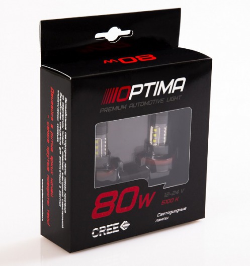 Светодиодная лампа Optima DRL CREE 80W H11, H9, H8, H16 12-24V 5100K – это лампы с увеличенной светоотдачей. Такие показатели достигаются благодаря использованию современных технологий CREE. Лампы Optima работают эффективнее, характеризуются более мощным световым потоком.