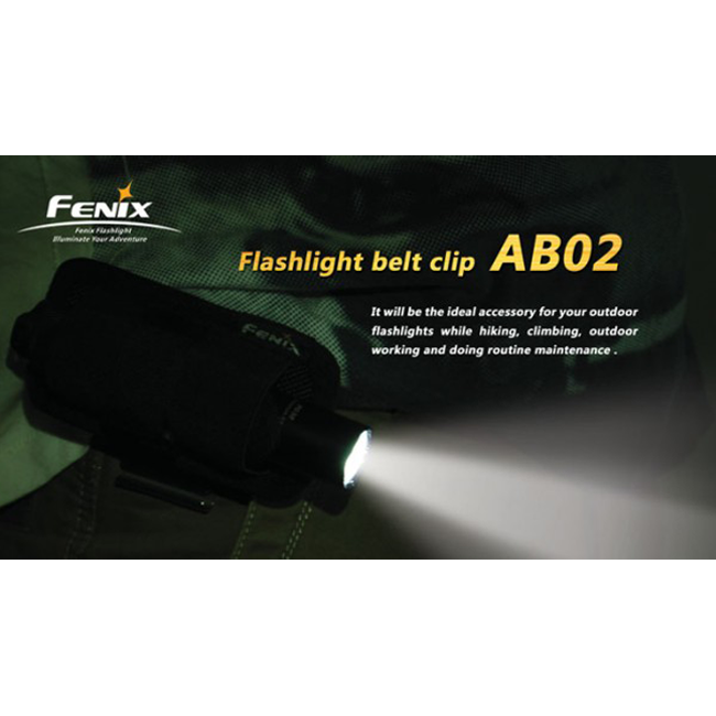 Клипса-держатель под названием Fenix AB02 совместима со множеством различных моделей фонарей из серий E, LD, PD, TK, UC. Для каждого из них такая клипса открывает возможность постоянно быть доступным для использования. При этом, руки владельца фонаря остаются совершенно свободными. Аксессуар представляет собою широкую стальную клипсу с кронштейном, положение которого легко регулируется. На кронштейне располагается тканевый синтетический чехол с фиксирующим ремнем, который закрепляет положение фонаря по отношению к клипсе и исключает его случайное падение на землю во время использования. Чехол предусматривает возможность полного поворота кронштейна вокруг своей оси. Таким образом пользователь может свободно регулировать необходимое направление для освещения.