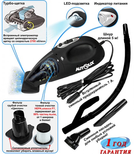 Автомобильный пылесос AL-777 Turbo- компактная, надежная и мощная модель с уникальной комплектацией. Вы удивитесь, узнав, что уборка салона Вашего автомобиля может приносить удовольствие - и занимать минимум времени, отнимая минимум сил. Возможность удаления влажной грязи делает эту модель настоящей находкой на осенне-зимнее время в том числе.