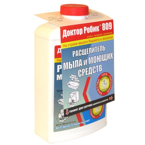Доктор Робик 809 расщепитель мыла и моющих средств содержит специальные ферменты и бактерии, уничтожающие мыльные скопления и наросты в трубах, ликвидирует пену в септических резервуарах и выгребных ямах. Применение Доктор Робик 809 предотвращает замыливание и устраняет отложения, возникающие в процессе эксплуатации канализационных систем. Предназначен для всех видов канализационных систем. Заливается один раз на целый год из расчёта один флакон (798 мл.) на 2000 литров. Не содержит едких веществ. Безвредно для окружающей среды. Рекомендуется раз в год откачивать содержимое канализационной системы и последующей промывкой водой.