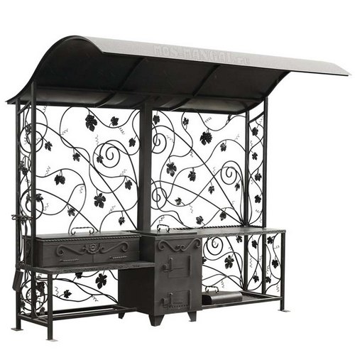 Мангал с крышей МС-102 – это мангальный комплекс с тремя функциональными зонами. У конструкции есть большой стол для подготовки, секция для жаровни и секция под печь. Эта оригинальная конструкция сочетает практичность, функциональность и необычный дизайн. Кованый мангал МС-102 украшен декоративными гроздьями винограда.