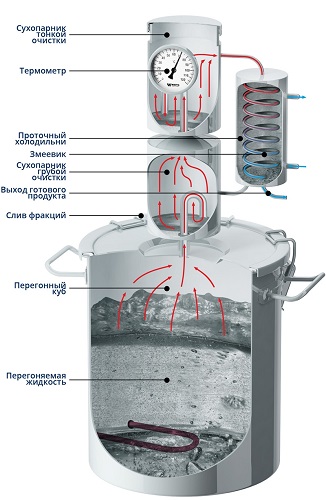 Теперь можно экспериментировать с новыми рецептами алкогольных напитков. Также в верхний сухопарник вмонтирован термометр, который позволяет контролировать оптимальную температуру паров в 73-78 градусов и получать наиболее качественный дистиллят.