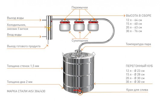 Используемая в производстве аппарата нержавеющая сталь является пищевой и ГОСТом была рекомендована к производству посуды и оборудования для алкогольной и пищевой промышленности.