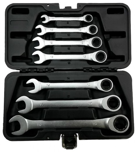 Благодаря этому пользоваться данным набором комбинированных  ключей с трещоткой 8-19 очень комфортно, ведь вы всегда можете быстро достать именно тот инструмент, размер которого вам необходим в данный момент. Кроме того, с помощью такого кейса вы не растеряете комбинированные ключи, и всегда сможете закончить начатую работу до конца.