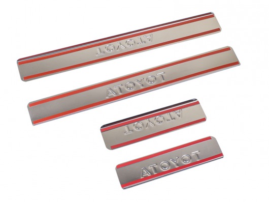 Внутренняя накладка на порог Toyota Corolla — это аксессуар автомобильного тюнинга, который защищает внутренний порог от механических повреждений при посадке и высадке из машины. Декоративные накладки с логотипом на внутренние пороги предназначены для автомобилей Тойота Королла до 2013 г.в.