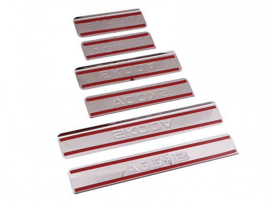 Накладки на металлические пороги дверей Шкода Ети с логотипом авто не только обеспечивают защиту верхней и боковой поверхности внутреннего порога, но и отлично вписываются в интерьер автомобиля, подчеркивая его стиль и индивидуальность. C монтажом проблем не возникнет: установка накладок на внутренний порог для Skoda Yeti производится на штатные места с помощью скотча 3M.