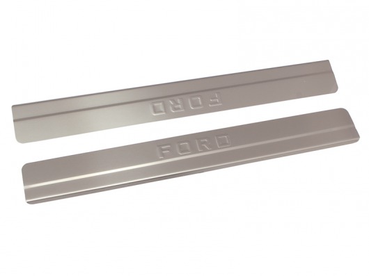 Накладки на металлические пороги дверей Форд Фиеста с логотипом авто не только обеспечивают защиту верхней и боковой поверхности внутреннего порога, но и отлично вписываются в интерьер автомобиля, подчеркивая его стиль и индивидуальность. C монтажом проблем не возникнет: установка накладок на внутренний порог для Ford Fiesta производится на штатные места с помощью скотча 3M.