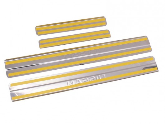 Накладки на металлические пороги дверей Ниссан Кашкай с логотипом авто не только обеспечивают защиту верхней и боковой поверхности внутреннего порога, но и отлично вписываются в интерьер автомобиля, подчеркивая его стиль и индивидуальность. C монтажом проблем не возникнет: установка накладок на внутренний порог для Nissan Qashqai производится на штатные места с помощью скотча 3M.