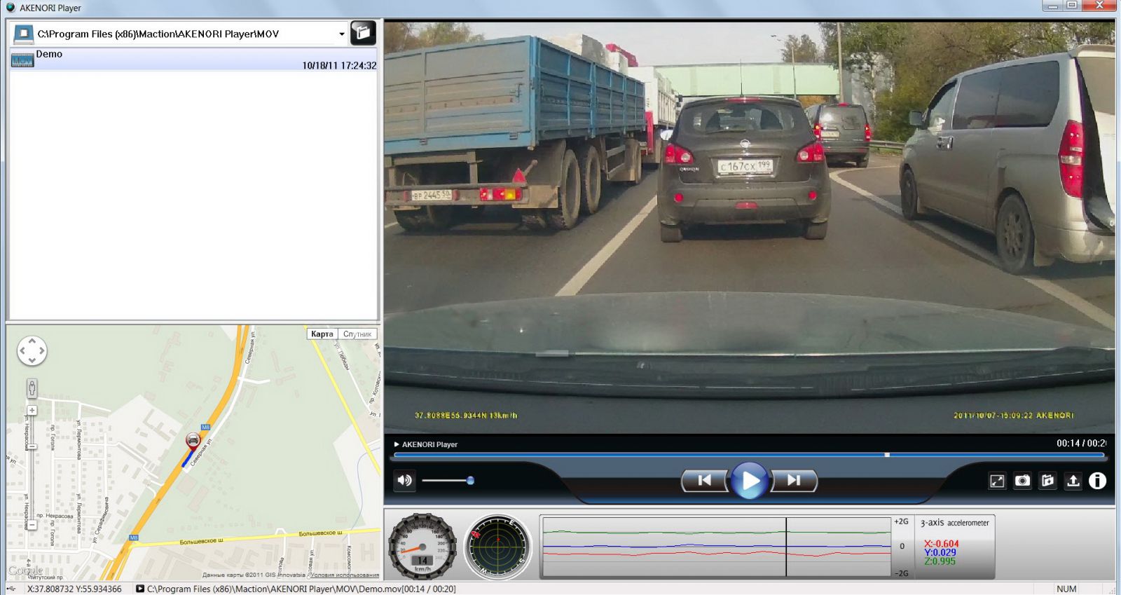 Помимо преимуществ в области съемки, модель DriveCam 1080 PRO выделяется среди других видеорегистраторов и другими важными особенностями. Во-первых, это система GPS-мониторинга. Она контролирует перемещение автомобиля, его скорость и направление движения. Все полученные данные можно просмотреть на компьютере. Для этого в комплекте вы получите специальную программу AKENORI Player.