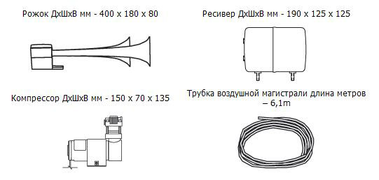 Комплект KIT 961 — это ярковыраженный бас на службе Вашего автомобиля. Вы можете разместить устройство под капотом или снаружи автомобиля на свое усмотрение. Основные запчасти можно расположить в разных частях машины: рожок, конечно же, ставится в передней части машины, а вот ресивер и компрессор — в багажнике либо салоне (если нет места в моторном отсеке).
