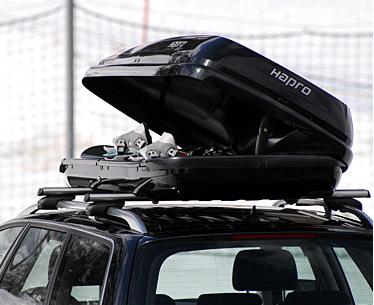 Автомобильный бокс Hapro имеет металлические профили в днище и комплекс рычагов двойного действия с пружинным механизмом. Функции рычагов: