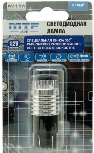 MTF W21/5W - светодиодная энергоэкономичная бесцокольная лампа. Цвет света - белый или красный. Свет очень яркий, но при этом отлично воспринимается человеческим глазом. Линза 360° полностью освещает расположенную у основания лампы площадь отражателя и точно повторяет распространение света штатной лампы.