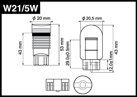 W21/5W двухконтактная. Используется для габаритных огней и стоп сигнала. Когда Вы подаете питание, промежуток времени с этого момента и до пика свечения у этой модели мгновенный. Это особенно важно в критических ситуациях, так как водитель сзади может быстрее среагировать на Ваш сигнал.